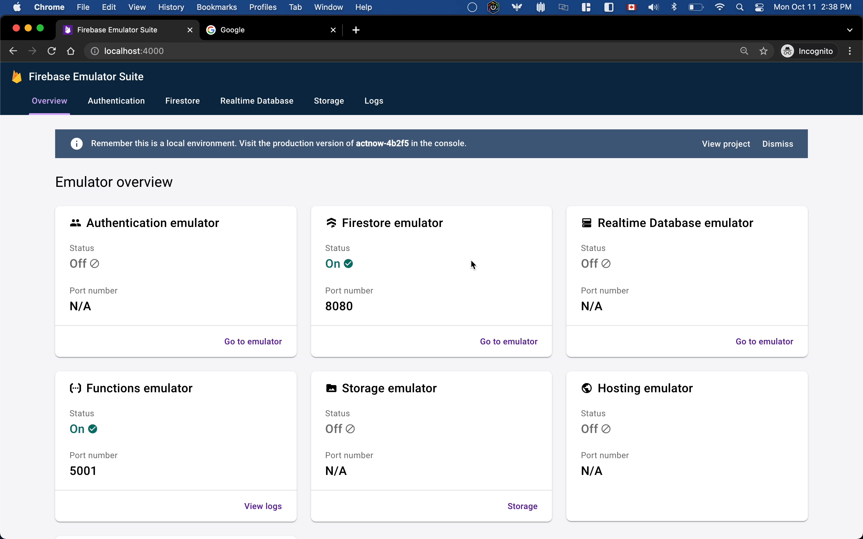 src/platformand runfirebase emulators:startto start a local firebase emulator with all the enabled firebase tools (currently we enabled cloud functions and firestore for local development) - Go into the cloud functions console and trigger any function you want to test that edits firestore